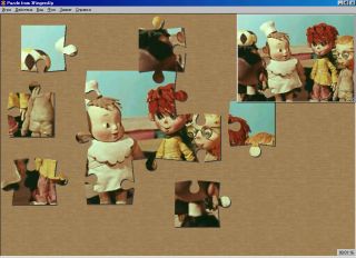 Puzzle from 3FingersUp v1.9 (466k, бесплатная) - пазлы для собирания разрезанных на части картинок (bmp или jpg). Тип, размер и количество элементов, на которые разбивается картинка, задаются пользователем. Для маленьких детей очень рекомендую включать режим "точная сборка" в настройках (не даст собрать картинку неправильно) и область захвата (притягивания элементов) сделать по меньшей мере 10 пикселов. К достоинствам следует отнести широкий выбор вида элементов. Немного раздражает: невозможность переразбить уже выбранную картинку по новым правилам (каждый раз приходится начинать новую игру), невозможность сохранить дирректорию для картинок (по-умолчанию выбирается папка "Мои документы") и то, что количество частей автоматически выбирается программой в зависимости от размеров картинки (потом это можно исправить). Сайт программы похоже лежит... А картинки можно надёргать из мультфильмов.